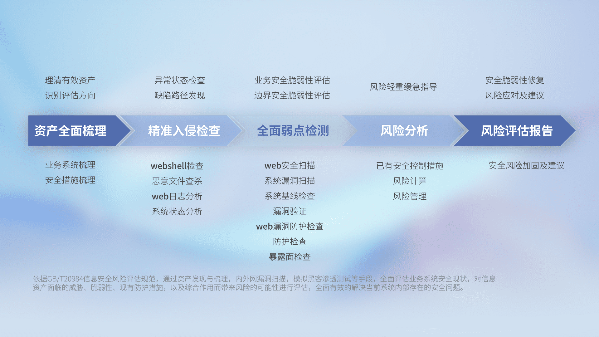 针对客户行业特性,,以专业的安全服务+多厂商联合解决方案提供专属的一站式安全管理服务,,,,帮助客户全面感知网络空间威胁,,,,基于识别、、、、检测、、、、分析、、、、防护、、、监测、、、响应的服务理论模型,,从方案咨询、、、、集成交付、、评估验证、、、优化加固、、、运维运营,,致力于为客户提供完整的闭环管理式安全服务。。以实战经验为客户打造高抵御风险的安全体系,,,,帮助客户发现威胁、、、、对抗威胁、、、、处置威胁,,,,不断积累安全对抗能力,,,,持续保障数字化安全。。。